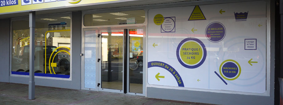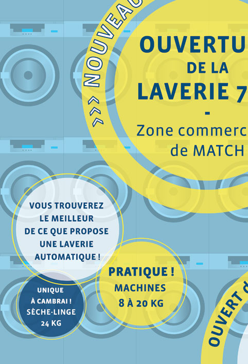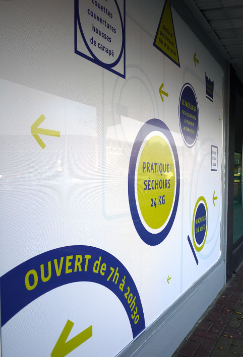 > création de la communication d’une laverie (SAUF ENSEIGNE) : affiche, flyers, dépliants et vitrine.